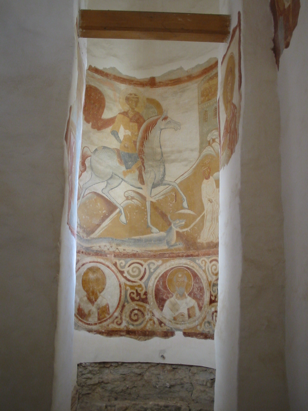 Церковь Святого Георгия реставрировалась только снаружи. Внутренняя отделка выглядит так, как и во время создания, если не учитывать обвалившиеся фрески. Обвалившиеся фремки собирают и реставрируют, однако на стены церкви они не возвращаются. В самом лучшем состоянии остался купол церкви и фреска с изображением святого Георгия, побеждающего Змея святым словом. Фреска выглядит просто идеально, учитывая ее немалый возраст. Фотографировать в храме запрещено, поэтому ее фотографию тут выкладывать не буду. Интересно отметить, что в интенете много написано про то Георгий поражает Змея копьем. На самом деле это не так. В руках у него только древко, а Змей поражен молитвой.