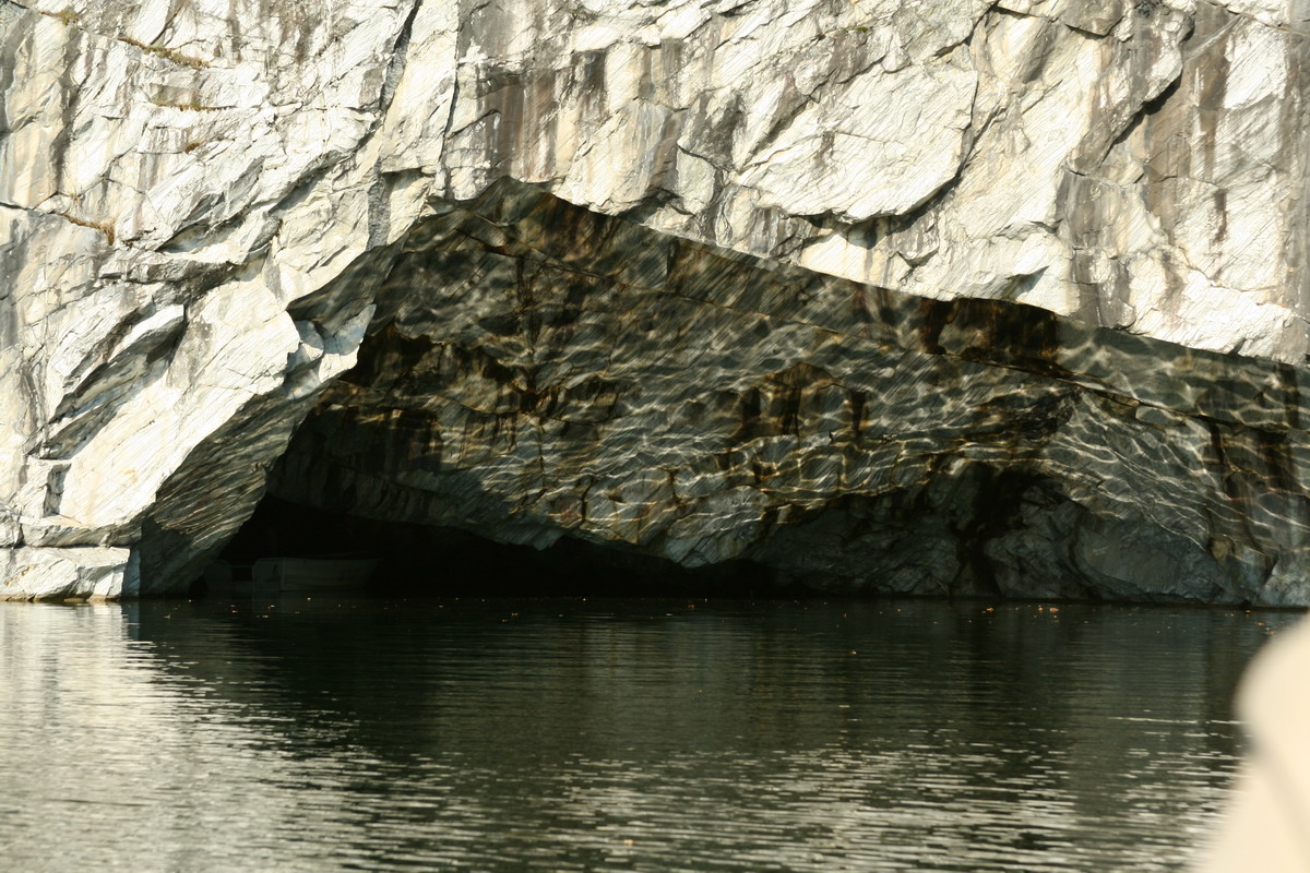В солнечных лучах просвечивают мраморные глыбы, не вывезенные из карьера. Говорят, что можно разглядеть останки тракторов и прочей техники, которые так же находятся под водой.