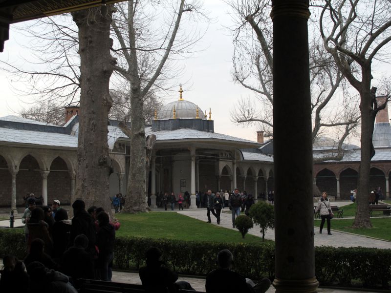 На самом деле, Топкапы – это не просто дворец, а огромный дворцово-парковый комплекс. Строительство дворца началось в последней четверти XV века. Структурно, дворец делится на зоны дворами. Первый двор — хозяйственный. Второй двор отводился под заседания дивана — это государственный совет при султане. Третий и четвертый дворы — личные покои Султана.