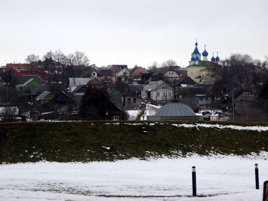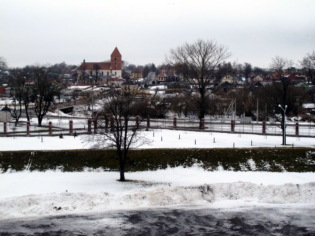 На пейзаже видно парковку около замка, яркие палатки сувениров. Парковка бесплатная, сувениры не очень, но стоят копейки. В поселке видно католический собор. Еще рядом с замком есть кафе с очень умеренными ценами. Еда там не ахти, но согреться и попить чаю-кофе можно, тем более, что чай там заваривают правильно.