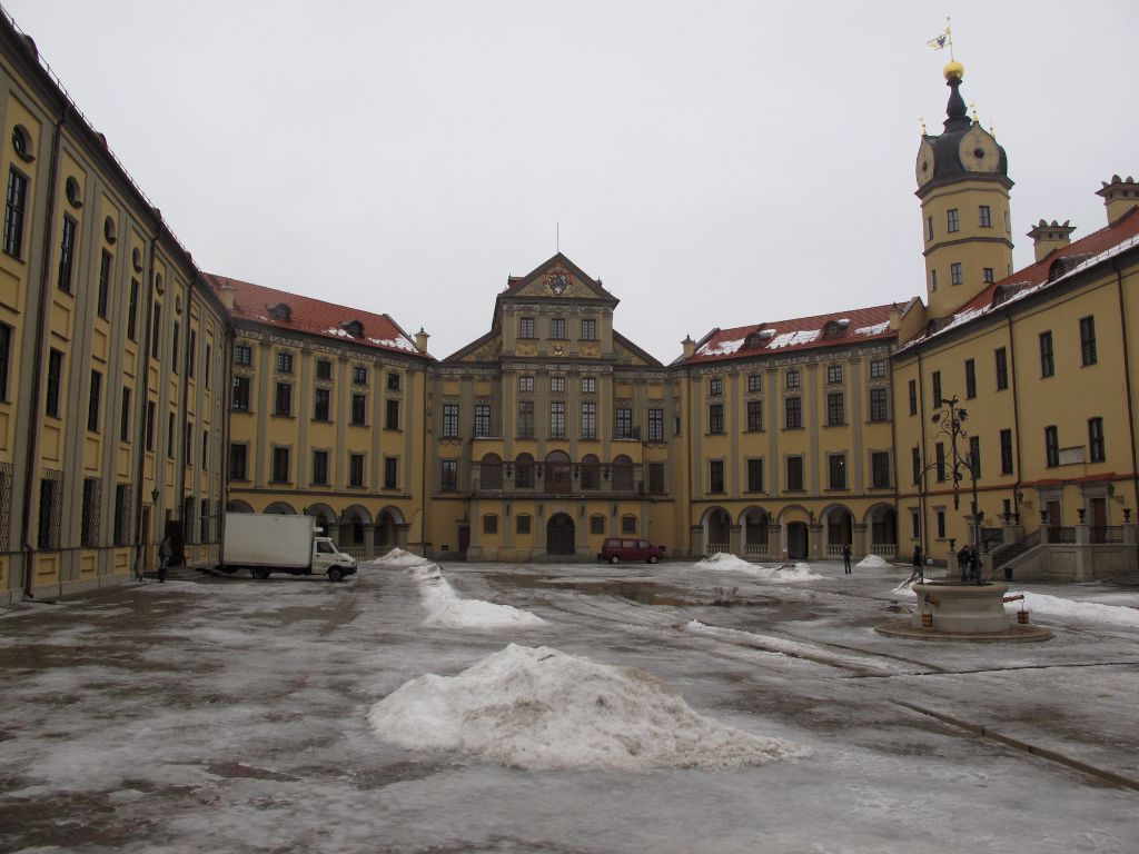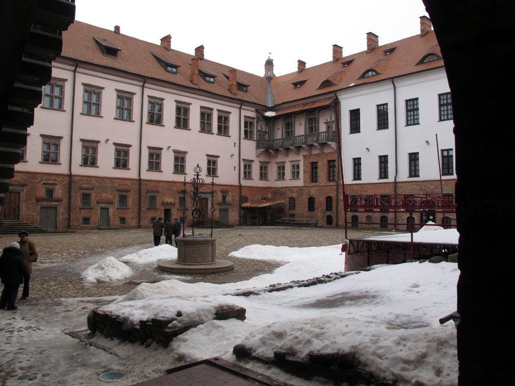 Во дворе тоже есть колодец. Но выглядит всё совсем по-другому, хотя корни у замка так же польско-литовские, да и достраивали Мирский замок то же семейство, что и Несвижский.