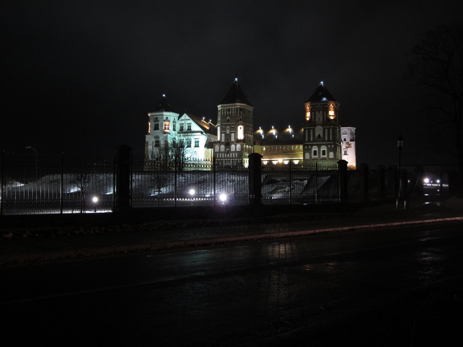 По дороге обратно заехали снова в Мир и сфотографировали ночной Мирский замок. Очень красиво.