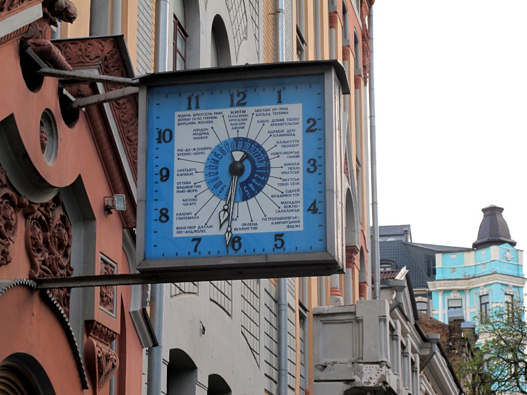 После краткого осмотра Святой Софии пошли на Андреевский Спуск. По пути обнаружил оригинальные часы на почте. Подозреваю, указы ДИМ они не учитывают :)