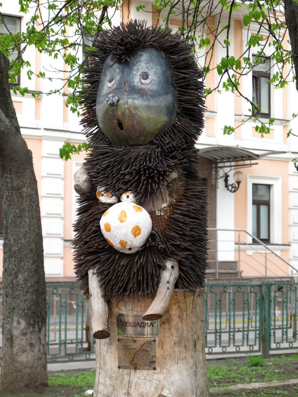 Возле церкви стоит памятник Проне Прокоповне и Голохвастову из произведения Старицкого «За двумя зайцами». Вообще в Киеве много интересных памятников. Но дольше всего меня будет занимать памятник Ежику. Точнее, подпись :)
