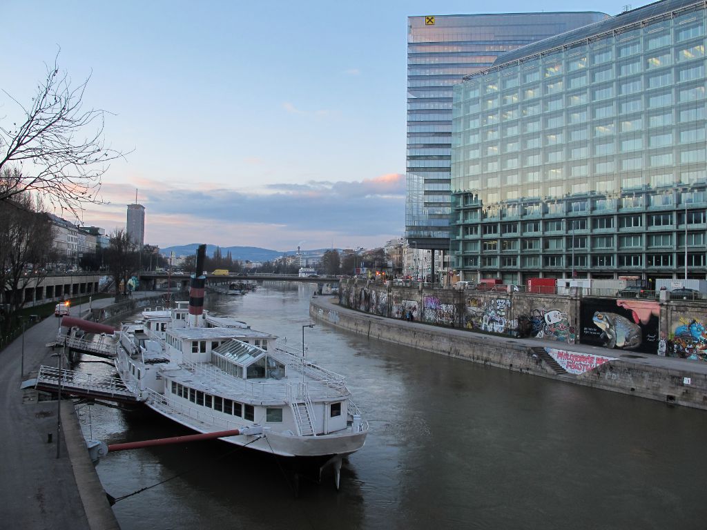 Выбрались из электрички мы на станции Wien Mitte. Это практически центр города. Сориентировавшись на местности пошли по направлению к самому-самому центру. Сразу на дороге попался мост и река. Ура, фотографировать! Но оказался чем-то… не слишком впечатляющим.