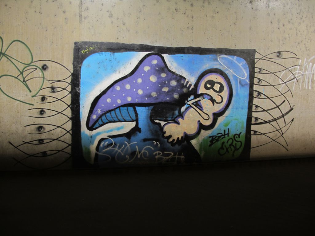 На его стенах попадаются очень забавные граффити, которые вполне можно отнести к элементам городского дизайна, а не варварству.