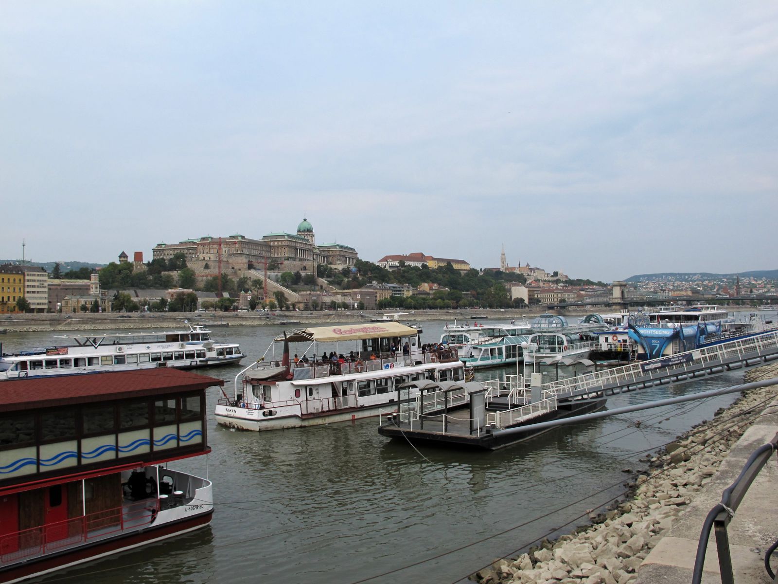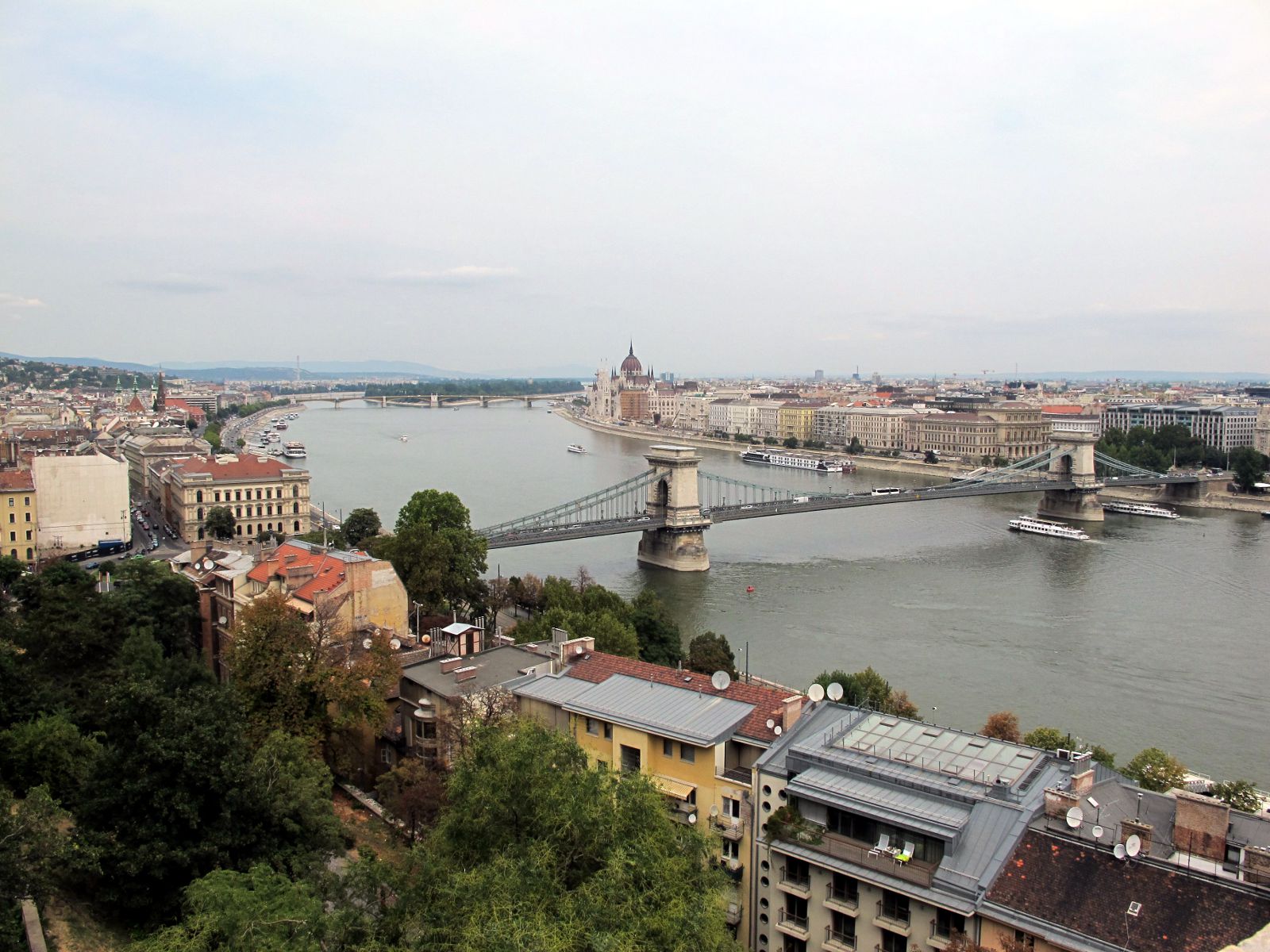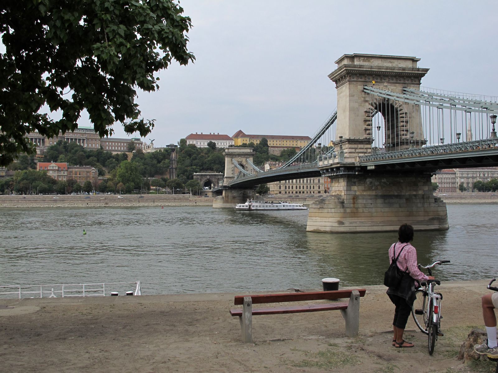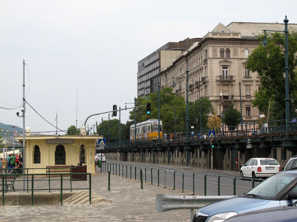 Мы прошли по набережной до Цепного моста Сечени, вдоль корабликов, готовых примерно за 300 рублей покатать туристов по Дунаю. По обеим сторонам Дуная курсируют трамвайчики по выделенным линиям. В трамваях по две кабины, и они просто меняют направление движения, переезжая на соседние рельсы.