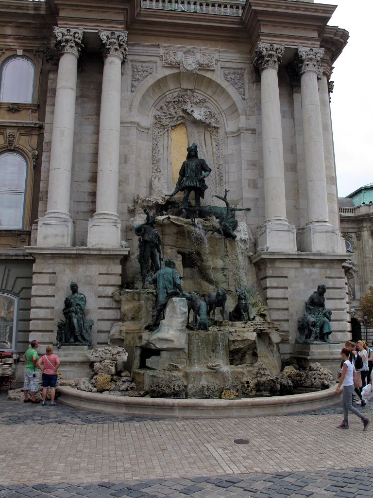 Памятник-фонтан с обратной стороны. Изображается сцена охоты короля Матиаша, который во время охоты встретил прекрасную девушку, она влюбилась в него, а потом, узнав, что он король, умерла.