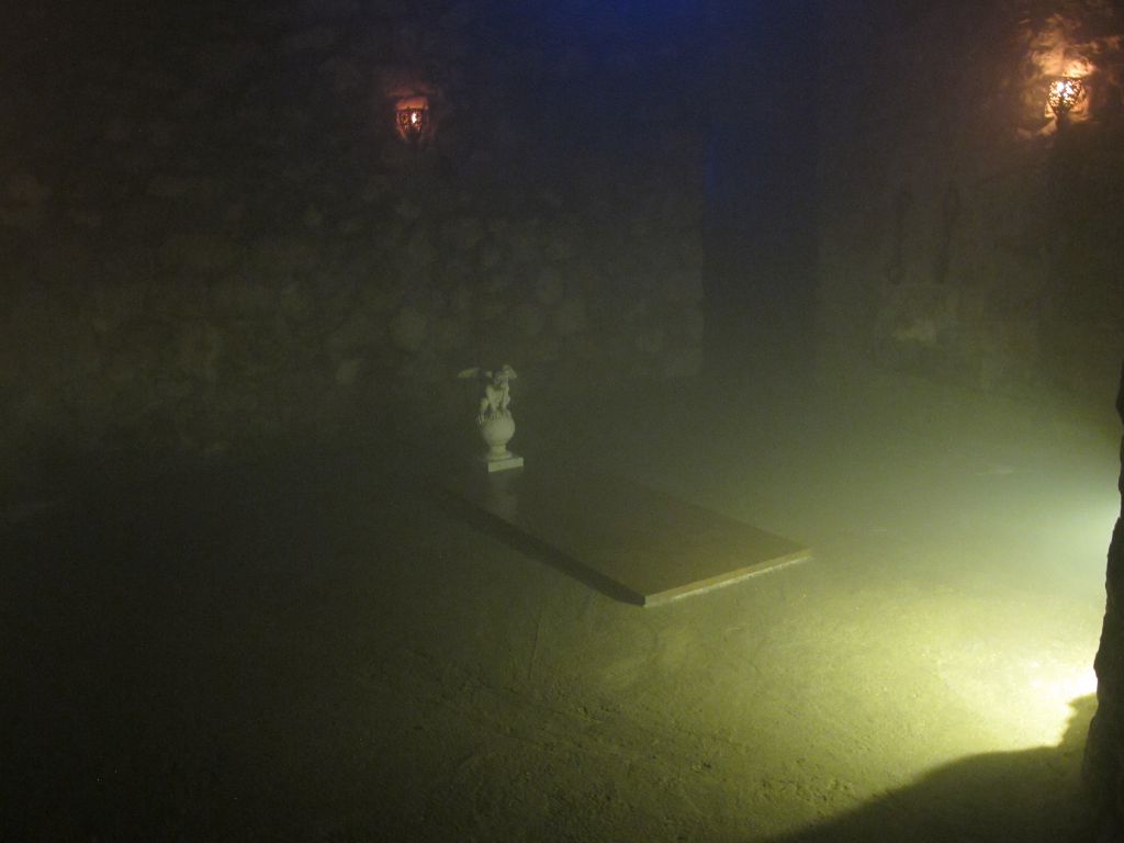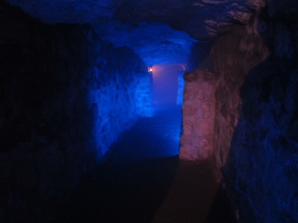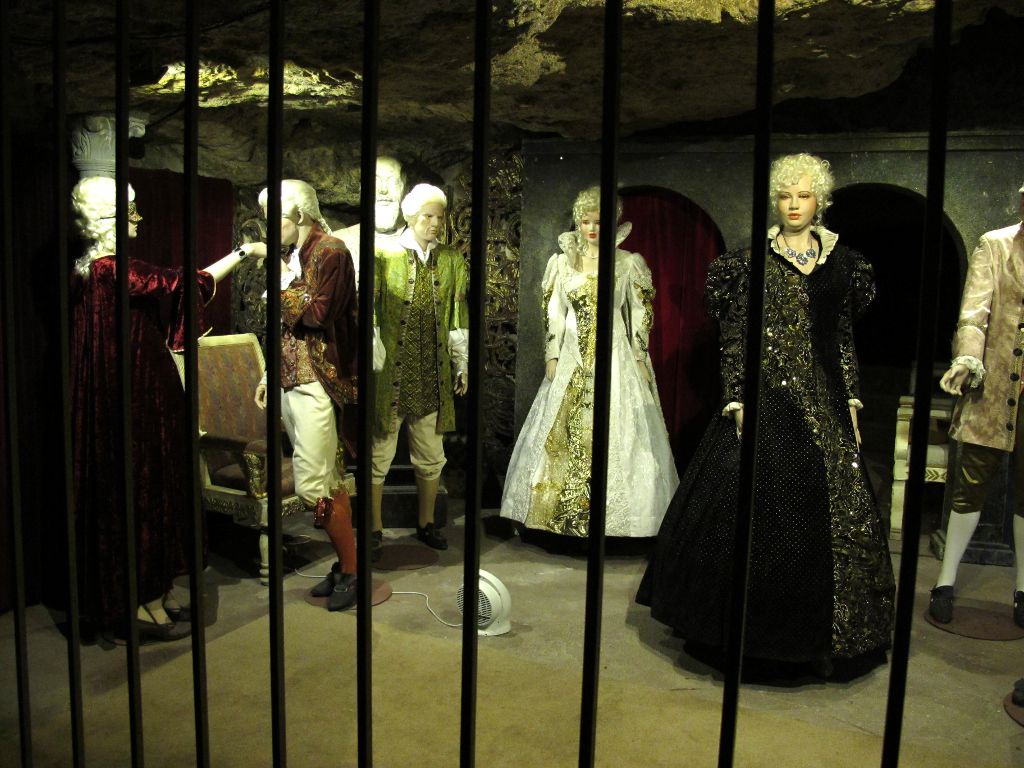 А мы, тем временем, спускаемся в лабиринт. Это подземелья, расположенные в горе. Разумеется, там были и контрабандисты, и повстанцы, и правительственные войска… А сейчас тут музей восковых фигур, катакомбы, таинственное освещение и могила Дракулы, который сидел тут в тюрьме.