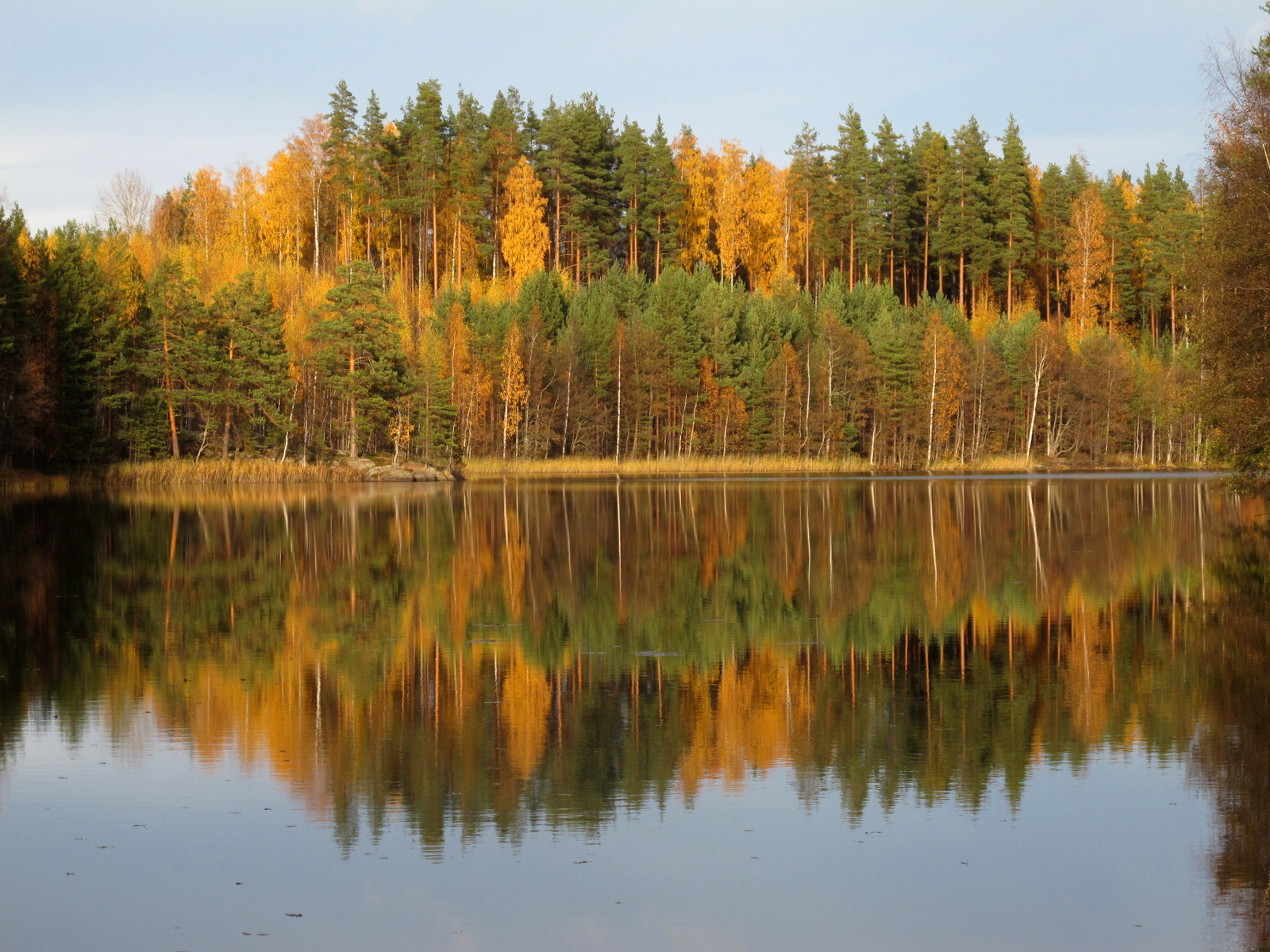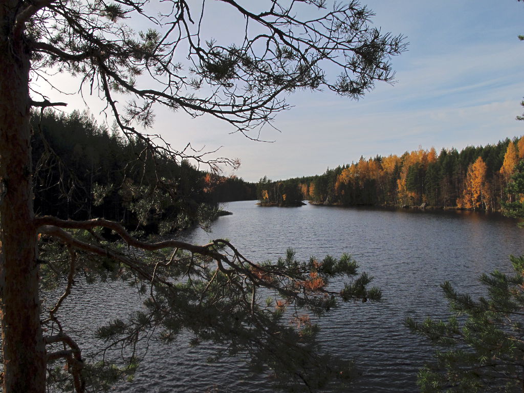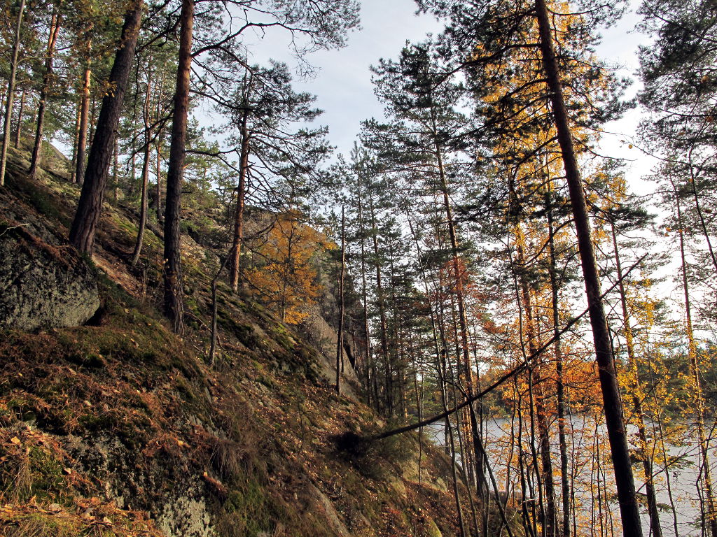Сказать, что пейзажи разные — не сказать ничего. Отойдя на несколько сотен метров от светлого осеннего озера мы угодили в мрачноватый сосновый лес