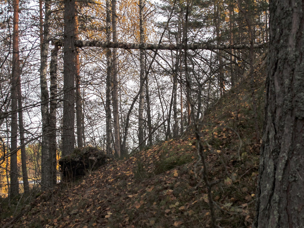 Вокруг абсолютная тишана. Разумеется, от техногенных звуков. Птицы поют, деревья шелестят, вода плещется, все как положено. Неожиданно нас обгоняет группа финов. Оказывается, не только мы хотим приобщиться к истории.