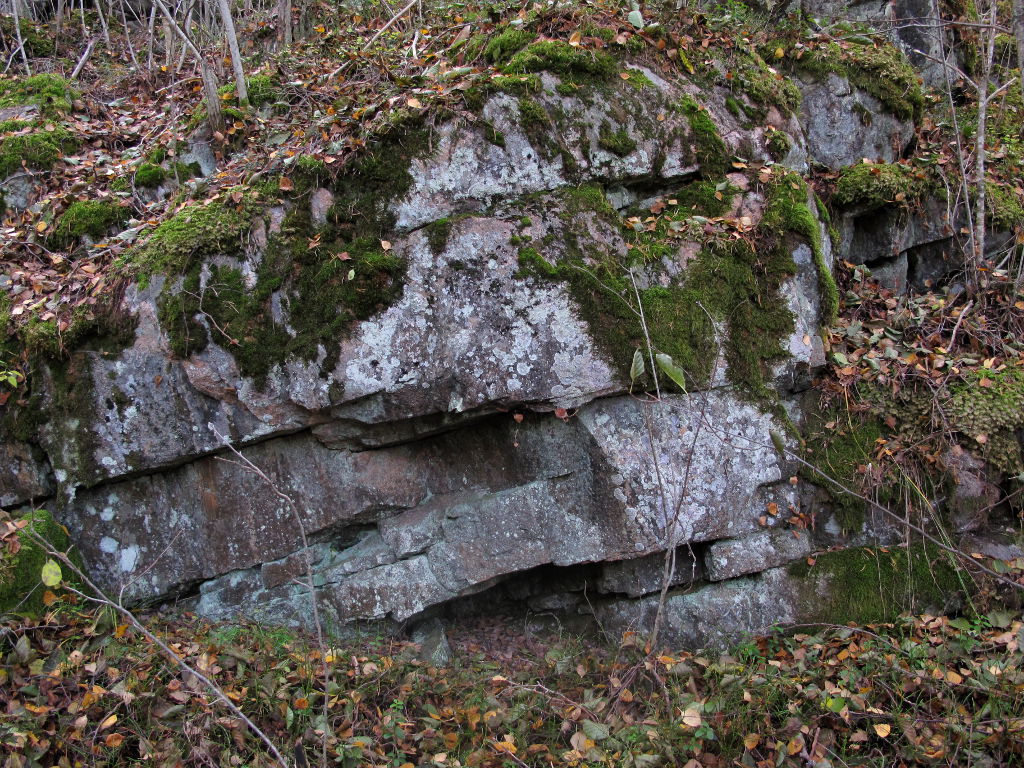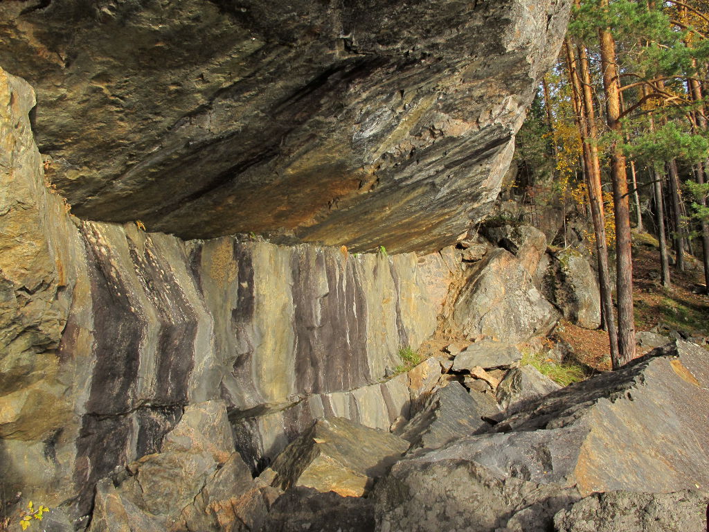 Неожиданно вдоль тропинки вырастает скала. Всё выше и выше. Вот ее начало.