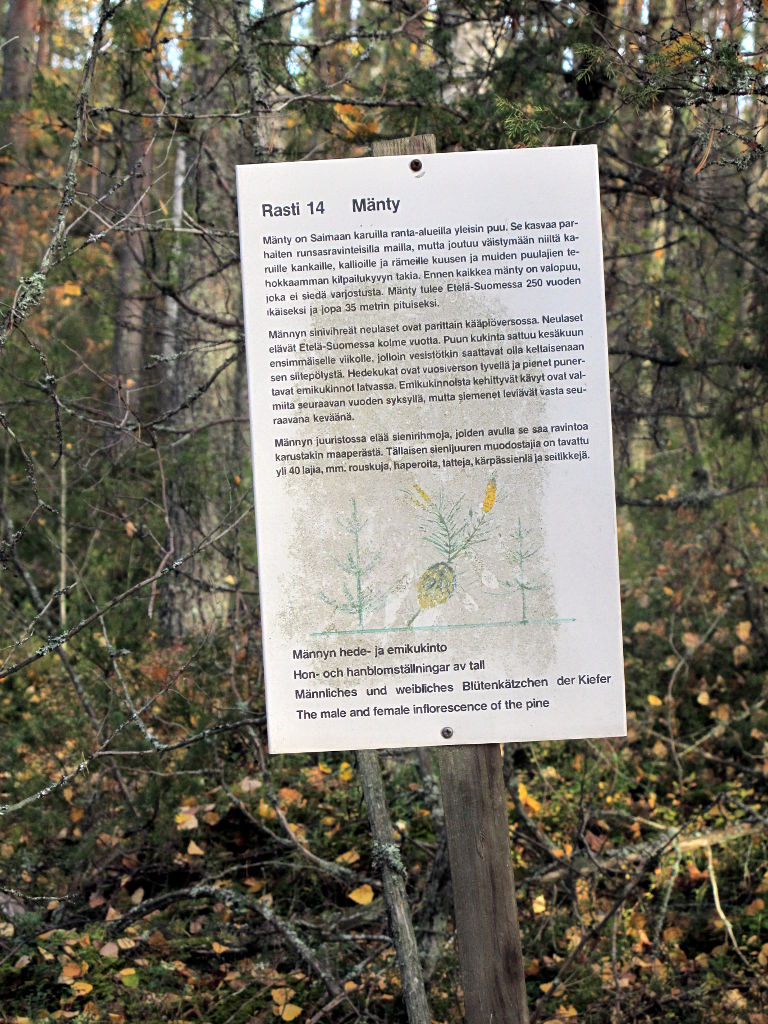 На этом плакате рассказывают про сосну. Кроме деревьев и кустов бывают плакаты посвященные животным, что тут водятся. На одном из плакатов были изображены принципы построения бобровых хат.