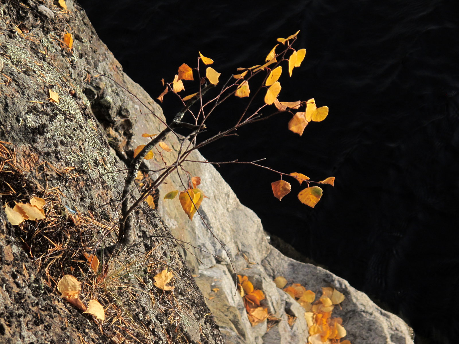 А с другой стороны снова сменяется озеро. Посреди — каменный остров. За что держатся деревья? Вот эти, например, две героические сосенки…