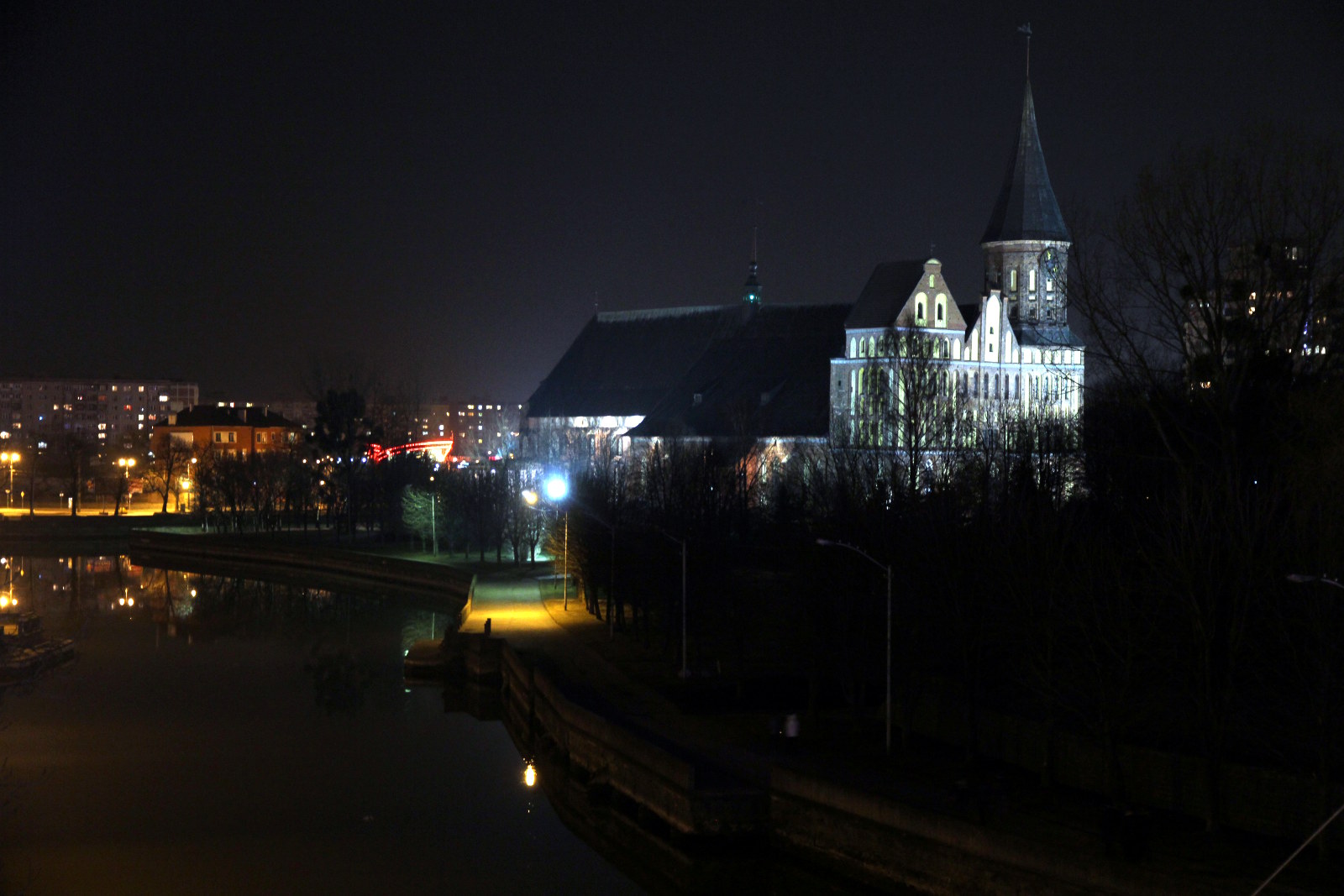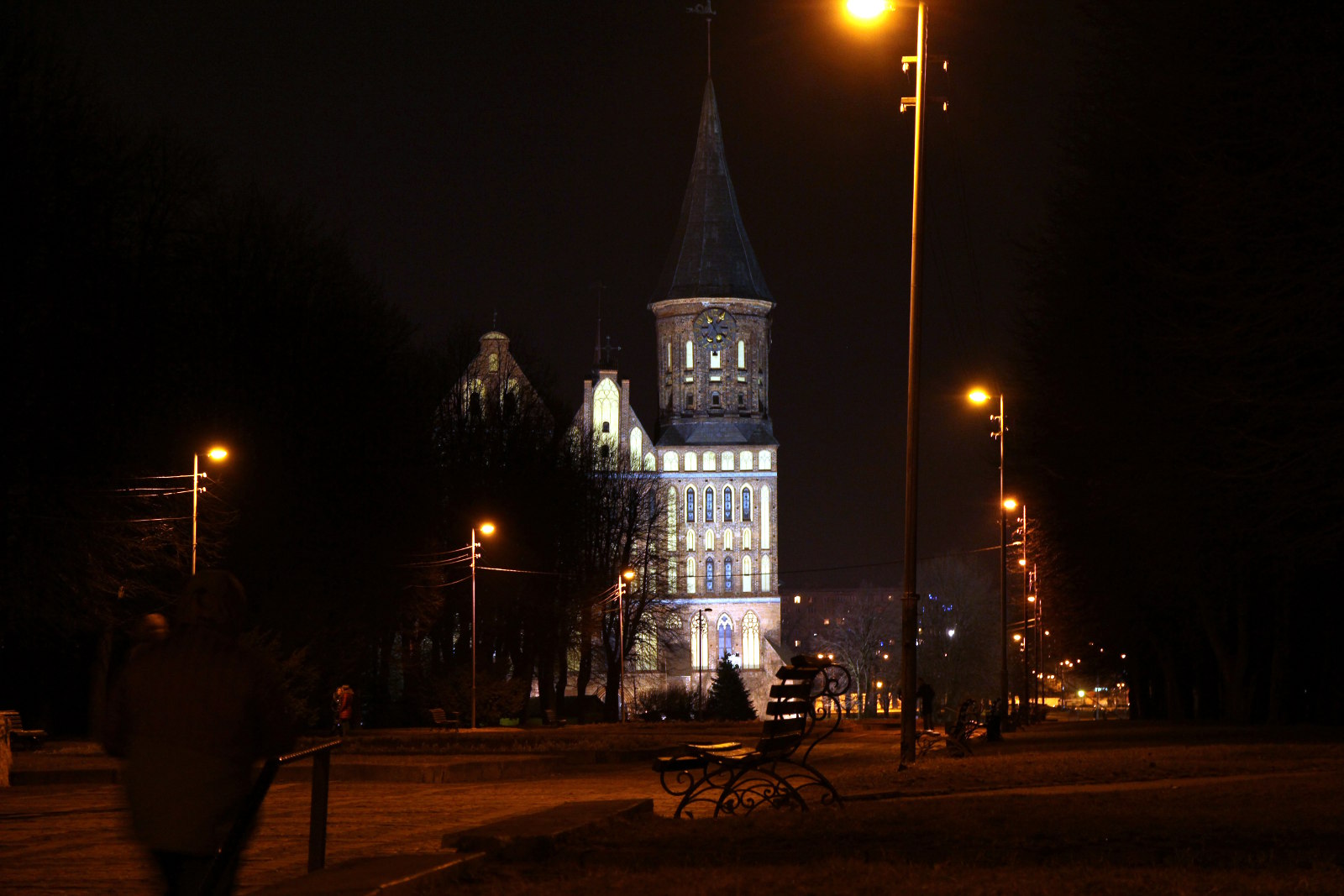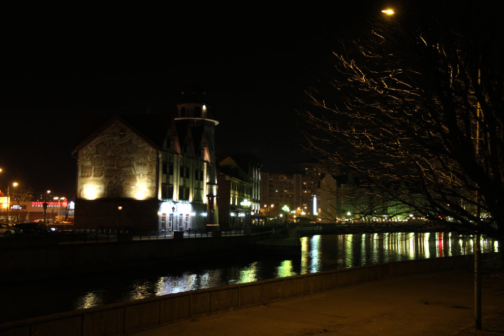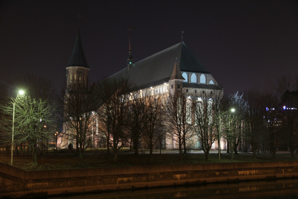 В Калининград мы прилетели практически ночью. Добрались за 500 рублей на такси до гостиницы, так как ближайший автобус надо было ждать минут сорок. Гостиница Ibis расположена до безобразия удобно, в самом центре города, через мост от Кафедрального собора. Разумеется, мы не могли сразу лечь спать и просто были вынуждены прогуляться, подышать местным воздухом и взглянуть на центральную достопримечательность. Вот она (или он? Собор же) одиноко возвышается, на острове, в ночи.