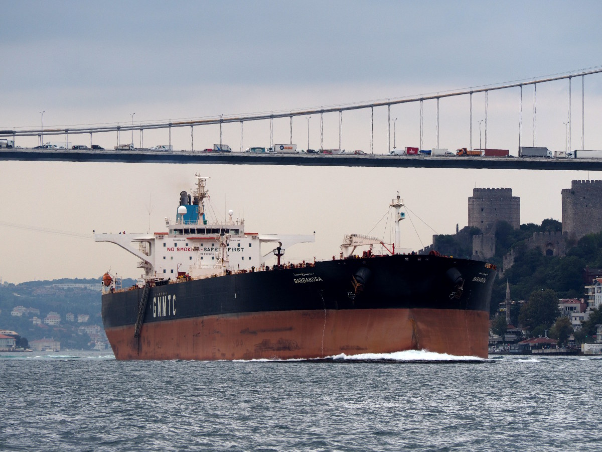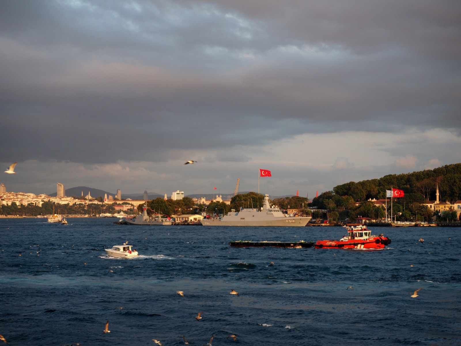 На следующий день поплыли к крепости Йорос. Можно найти тур, а можно просто за 25 лир на человека на маршрутном кораблике до Anadolu Kavagi. Правда, плавает он всего 2 раза в день: утром туда, вечером обратно. Берега Босфора я уже фотографировал и размещал, поэтому оставлю только самый впечатливший кадр. Корабли, которые плавают по Босфору. По-моему, очень хорошо на этом кадре размеры ощущаются.