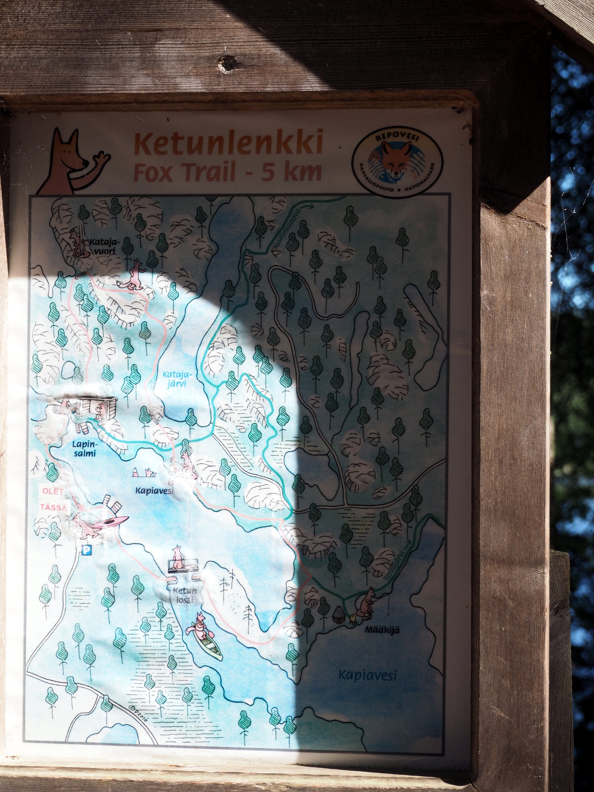 Существует несколько входов в парк. Мы приехали к входу Lapinsalmi: на Maps.Me я обнаружил возле него парковку, что подтолкунуло не разбираться дальше, а ехать прямо туда. Второй причиной выбора именно этого входа было расположение маршрутов. Мы решили пройтись по самому популярному и благоустроенному: Ketunlenkki, лисеночьей тропе.