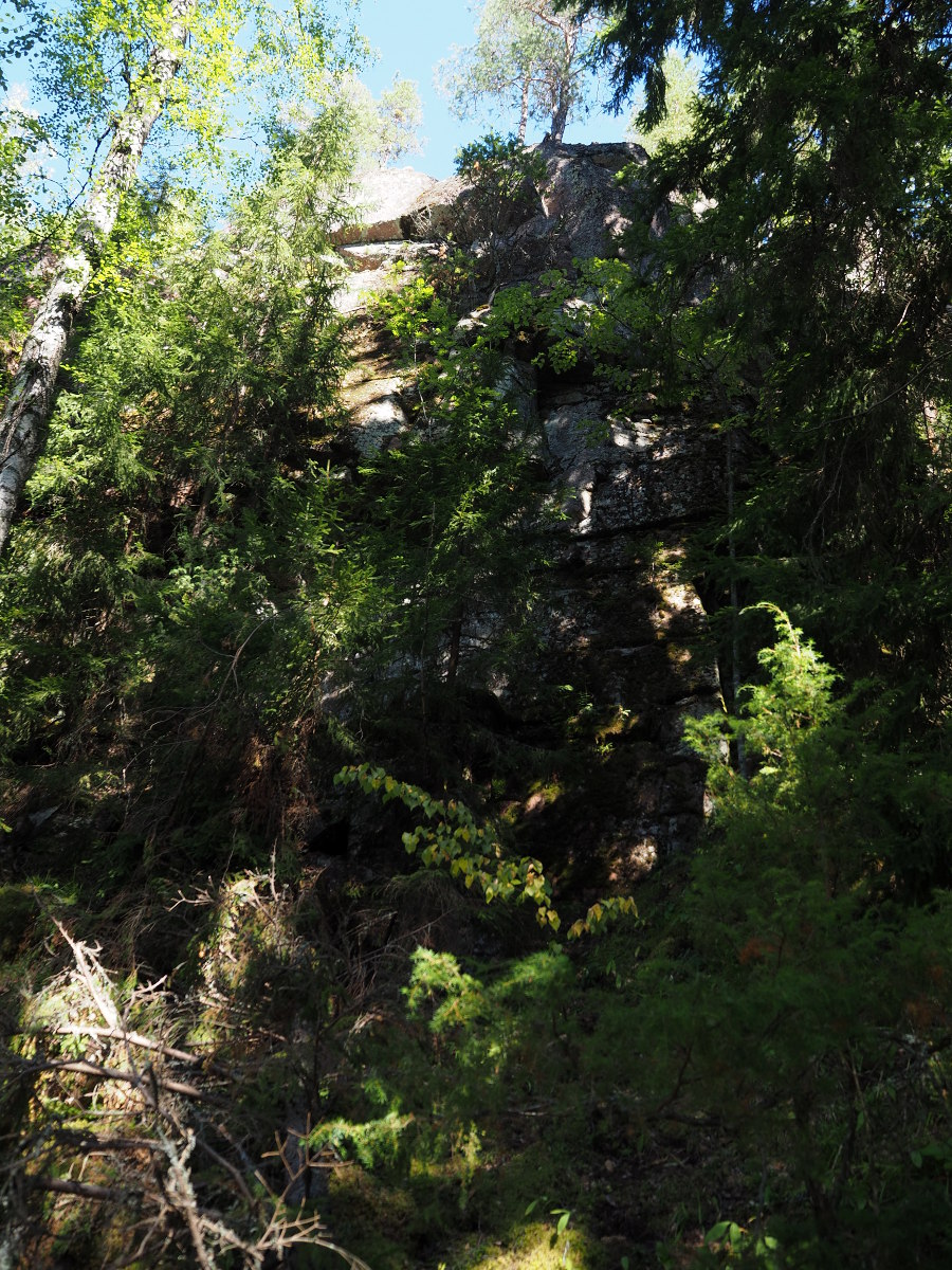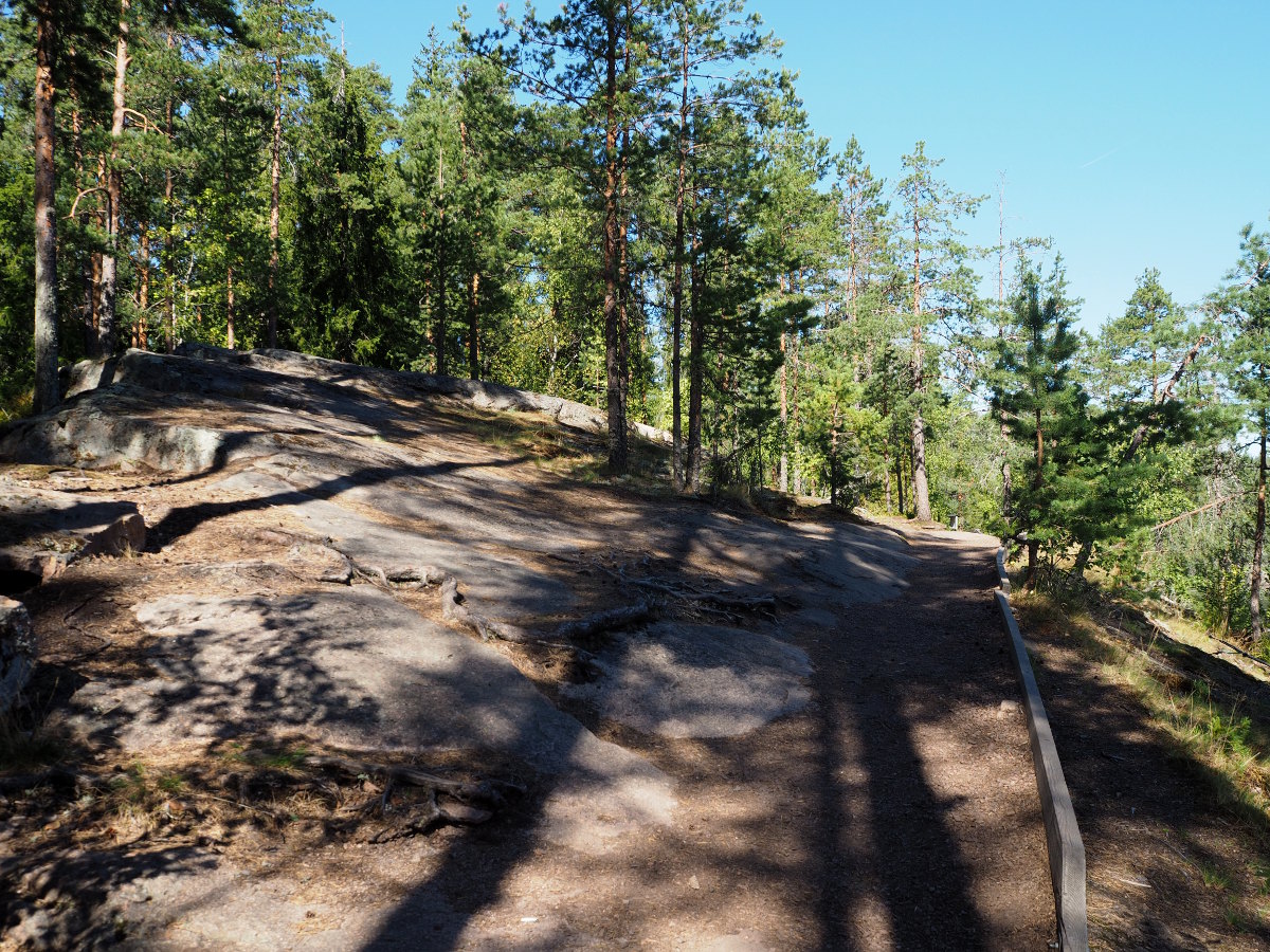 Очередная скала возле тропы. Рядом очередная табличка, повествующая о животных и деревьях края. Информация на финском, английском и русском, всё как на первой табличке.