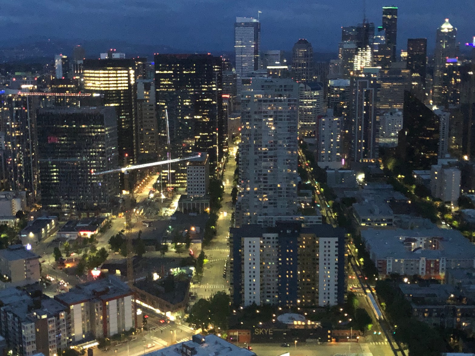 В Сиэтл мы прибыли поздно вечером. Самолёт опоздал больше чем на час. Сил и желания фотографировать и что-то смотреть уже не было, так что осмотр города мы начали утром с интернета, выясняя, как купить билеты на Space Needle. Выбрав совмещенные с посещением музея стекла Chihuly garden and glass билеты мы отправились гулять. И сразу возле гостиницы нам открылся отличный вид на башню