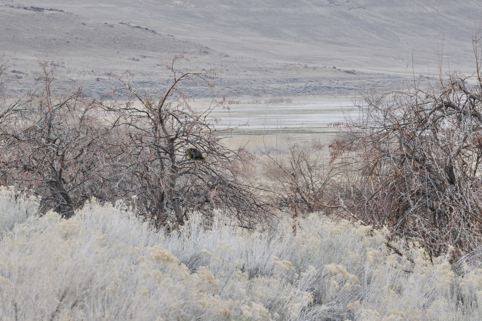 Выглядит это как такая меховая шапка на дереве. В Штатах распространена омела, поэтому на кусты в кроне дерева не обращаешь внимания. Но тут я искал что-то такое, потому выделил необычный контур в стороне от трассы.