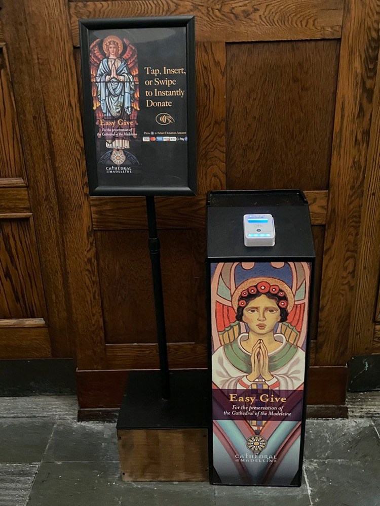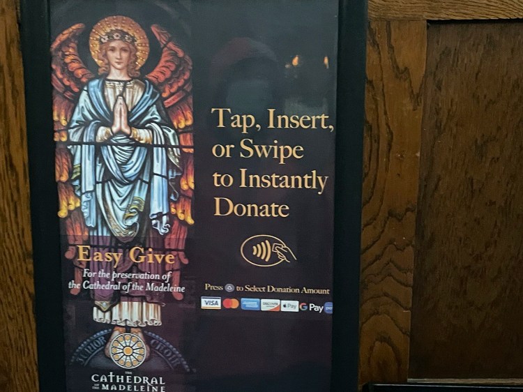 Прибор для улучшения кармы. Принимает пожертвования даже с Apple Pay. Современные технологии на страже средневековых убеждений. Отличное сочетание!