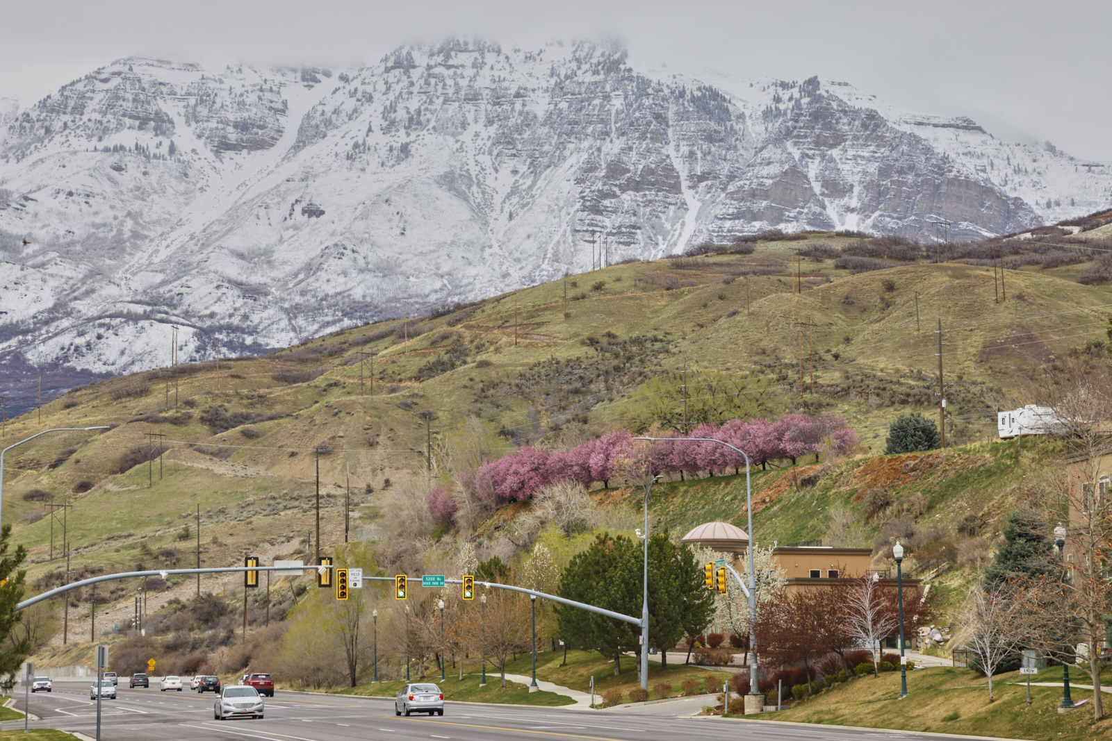 Вообще Salt Lake City расположен на высоте примерно 1,3 км над уровнем моря. Прямо рядом со Скалистыми Горами (Rocky Mountains). Тут континентальный климат. Если в Калифорнии в середине апреля уже появляется выжженная солнцем трава, то тут только зацветают фруктовые деревья и может легко пойти снег. А ущелья в горах сопроводят дожди суровым порывистым ветром сдвигающим машину на пол полосы в сторону. А вообще очень напоминает Питер, КАД.