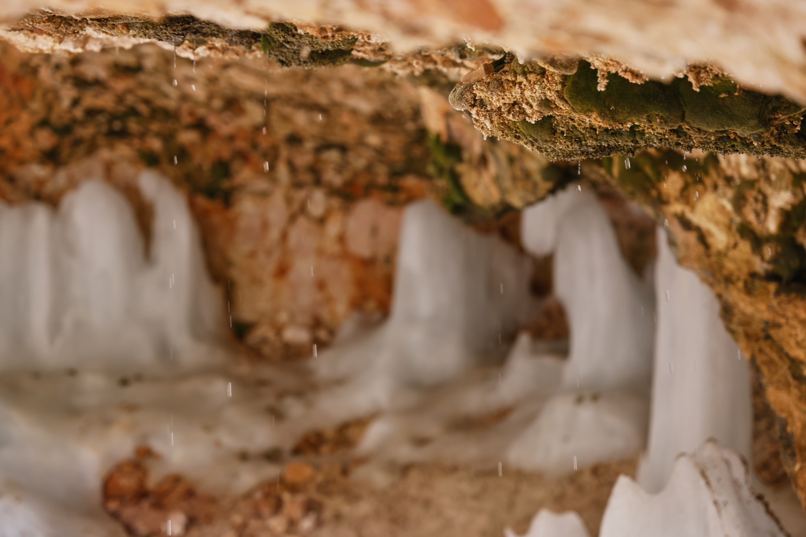Тут сверху сыплется мелкий водопад. Особенно когда пригреет солнце. А внизу чертоги Снежной королевы